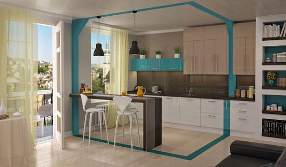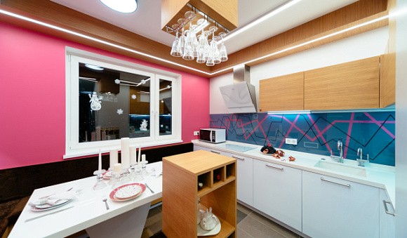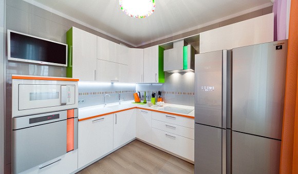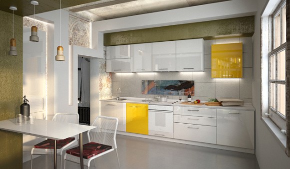 Линейная версия – идеальный вариант для небольшого помещения. Модули такого гарнитура займут место вдоль одной стены. При этом в них без труда уместится вся посуда, бытовая техника и столовые приборы.