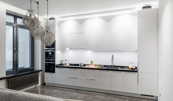Параллельные кухни в белых тонах – отличное решение для пространства прямоугольной формы. Модули в этом случае расставляются друг напротив друга. При этом расстояние между ними должно составлять 1,2-1,5 метра. Благодаря этому вы сможете без труда передвигаться между шкафами.