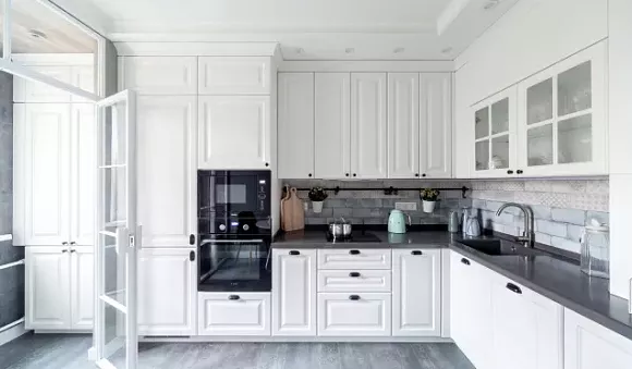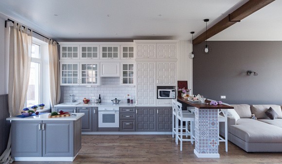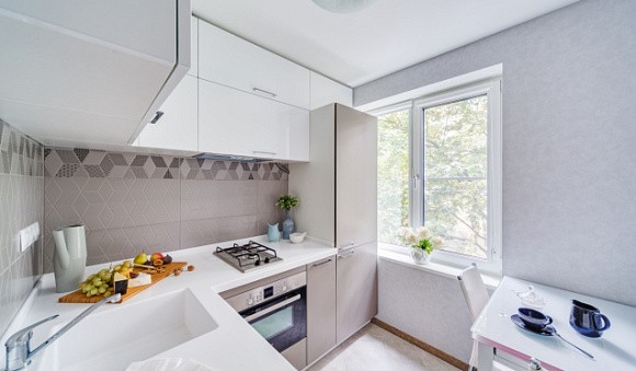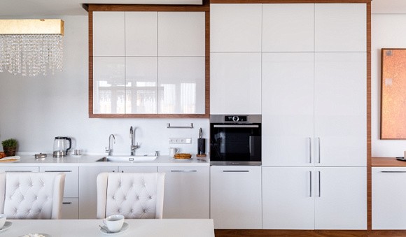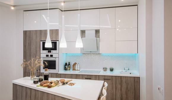 Кухонный гарнитур белого цвета будет смотреться более выигрышно, если оформить его деталями других оттенков. В небольших пространствах лучше использовать вставки светло-серого, голубого или бежевого тона.