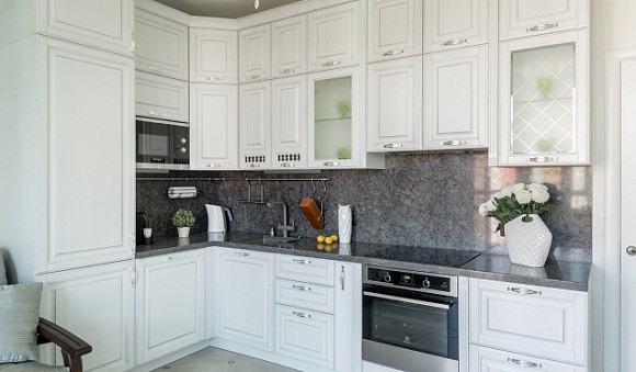 При покупке комплекта обязательно учитывайте его форму. Так, угловая кухня в белом цвете подойдет для помещения средних размеров. Подобная планировка позволяет рационально использовать свободный угол. В него обычно интегрируют полку, мойку или шкаф.