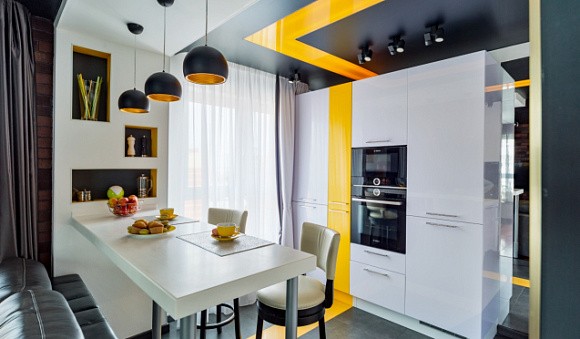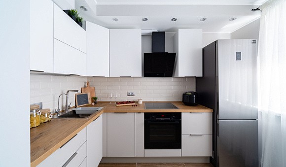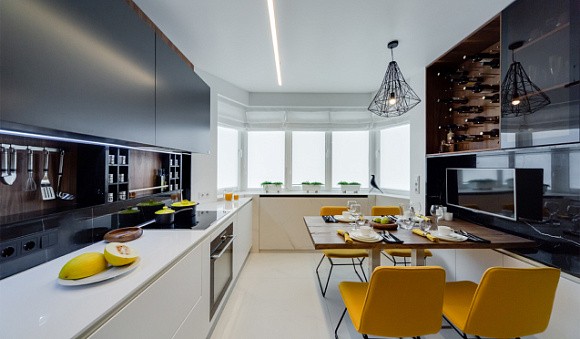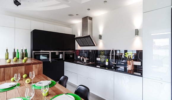 Белый и черный – беспроигрышный вариант для дизайна кухни. Подобное сочетание подойдет для оформления современного интерьера. В небольших пространствах черный цвет можно использовать точечно – в виде фурнитуры, открытых полок или столешницы гарнитура.