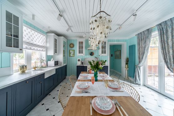 Белая кухня с бирюзой