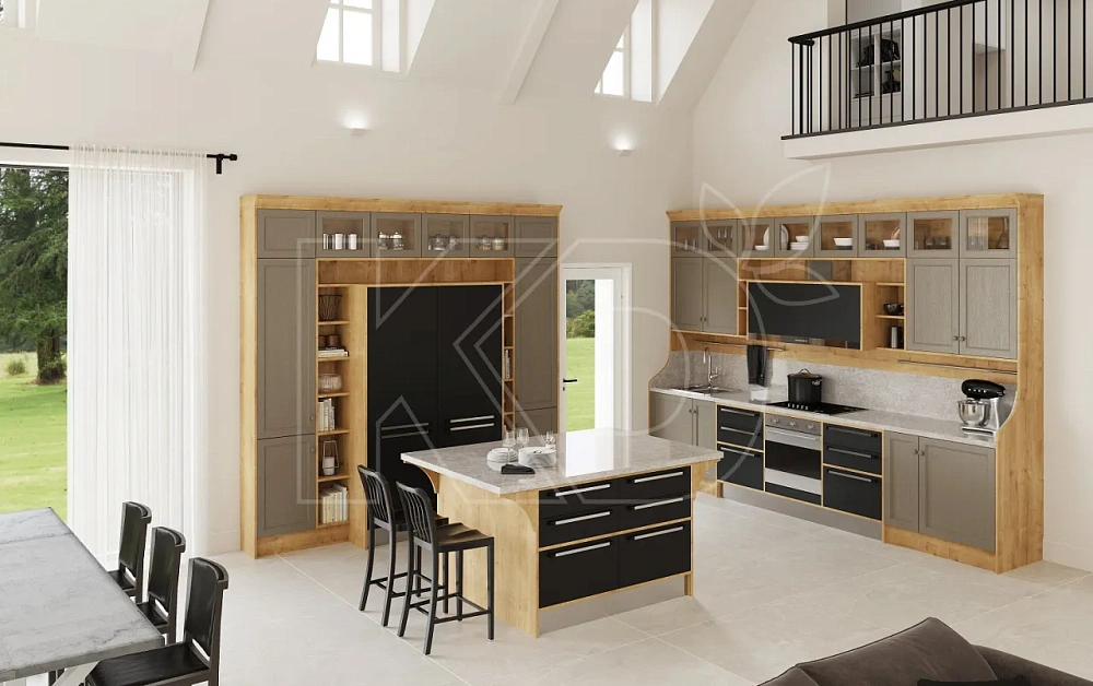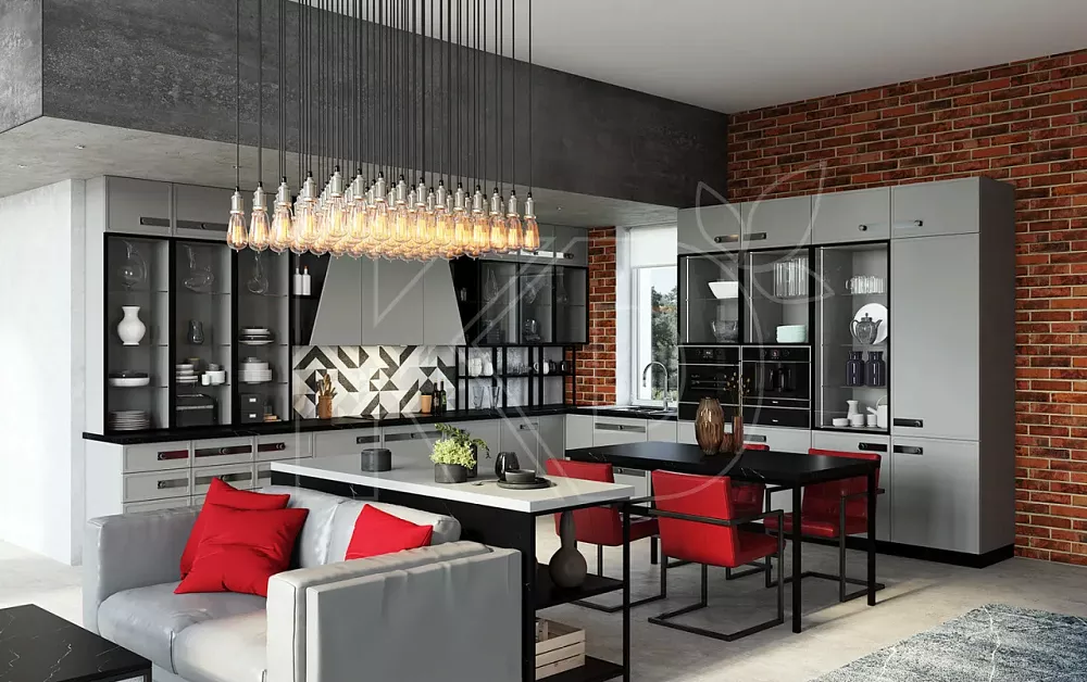 - Размер. Мебель размещается в больших столовых и поэтому имеет большие размеры. Планировка - П-образная или квадратная, обычно с островом. Кухонные гарнитуры более сложные и часто имеют барную стойку или витражные шкафы. Дешевые модели обычно меньше по размеру и имеют линейную планировку.