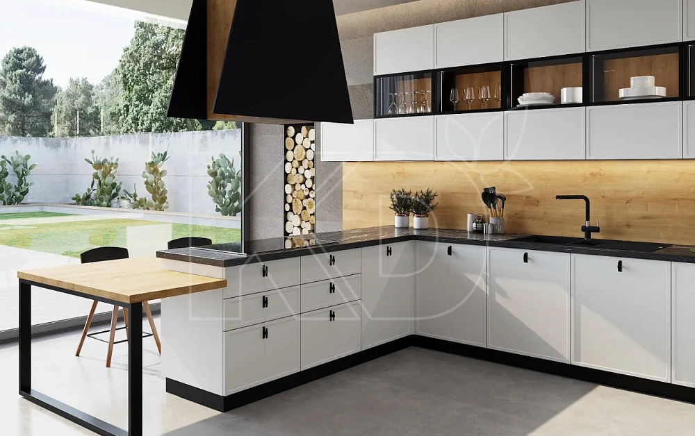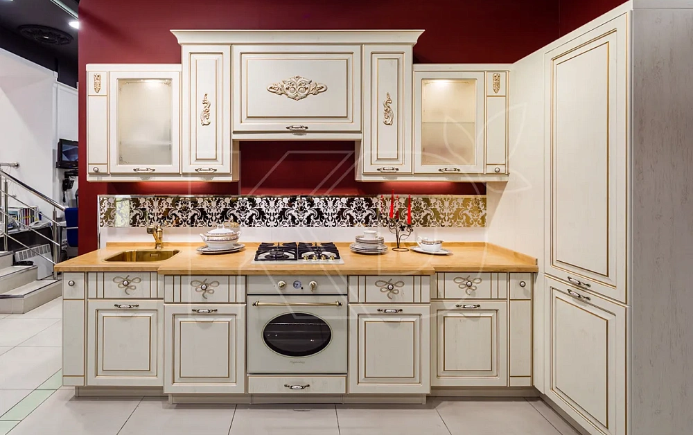 - Размер. Мебель размещается в больших столовых и поэтому имеет большие размеры. Планировка - П-образная или квадратная, обычно с островом. Кухонные гарнитуры более сложные и часто имеют барную стойку или витражные шкафы. Дешевые модели обычно меньше по размеру и имеют линейную планировку.
