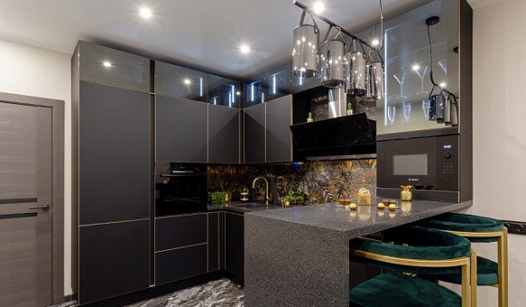 В этом году необязательно выбирать чисто черную угловую кухню. Вы можете выполнить нижние фасады в темных тонах, а верхние – в светлых, чтобы сыграть на контрасте. В результате кухня на заказ будет выглядеть еще роскошнее.