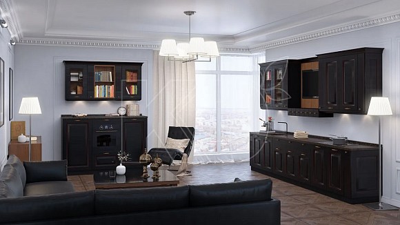 В традиционном варианте мебель выполнена в сдержанных лаконичных тонах: белом, коричневом, черном, бежевом. Чтобы внести яркий акцент в оформление гарнитура, нередко используется золотистая или серебристая патина, подчеркивающая антикварный вид фасадов. Такой строгий и респектабельный вариант обычно выбирают люди, склонные к консерватизму и желающие продемонстрировать свой высокий статус и безупречный вкус.