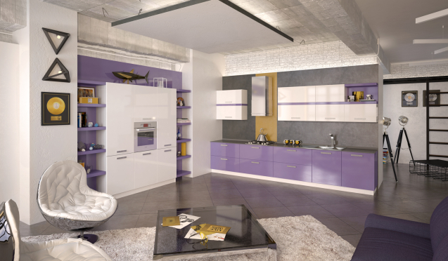 Белый цвет применяться может как в чистом, так и в «разбавленном» виде. Для создания уютной обстановки подойдут оттенки натуральной древесины. Это решение будет особенно уместно в студиях, где зона для приготовления будет фиолетовой, а обеденная – белой. Также стоит обратить внимание на гарнитуры, где верхняя часть выполнена с имитацией камня, а низ оформлен в ярком фиолетовом цвете.