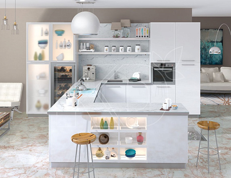 Глянцевые кухни со встроенной техникой используются для создания стильных современных интерьеров. Такие конструкции имеют привлекательный внешний вид и вмещают в себя все кухонные приборы и посуду.