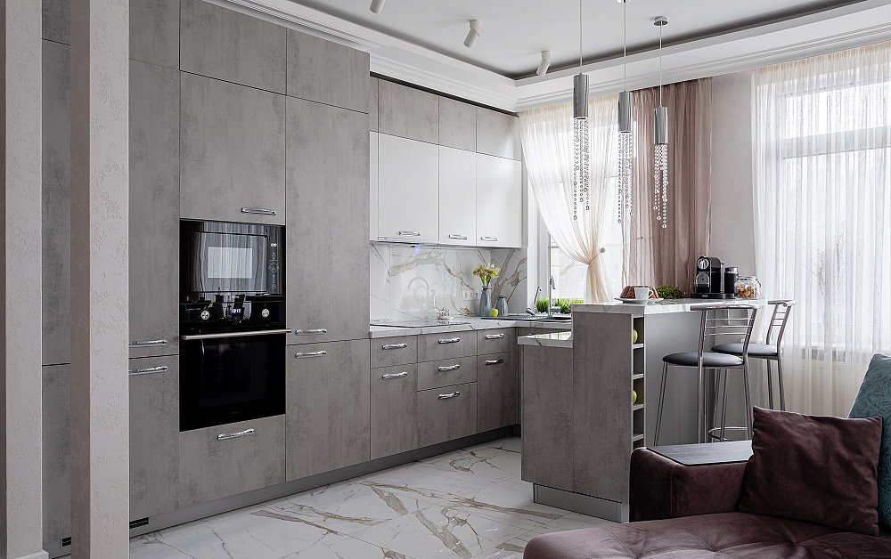 Столешница, заставленная разнообразной бытовой техникой, смотрится довольно неряшливо, особенно в небольших пространствах. Поэтому кухонная мебель со встроенной техникой выглядит гораздо привлекательнее. Спрятать за фасадами можно не только крупные предметы – вытяжку, духовой шкаф, посудомоечную машину, холодильник. Более мелкую технику, например, кофемашину, мультиварку и тостер тоже можно скрыть от глаз. Благодаря этому рабочая поверхность всегда будет выглядеть свободной и аккуратной.