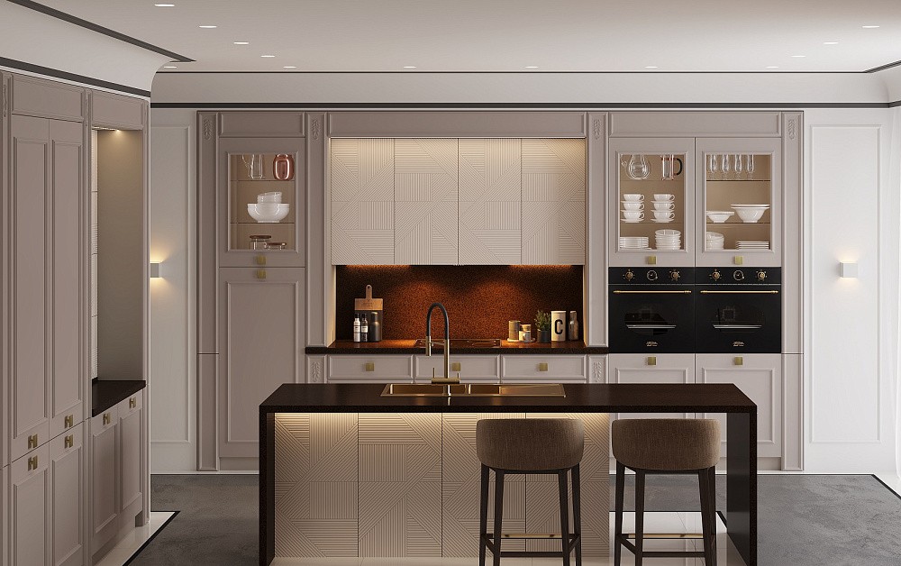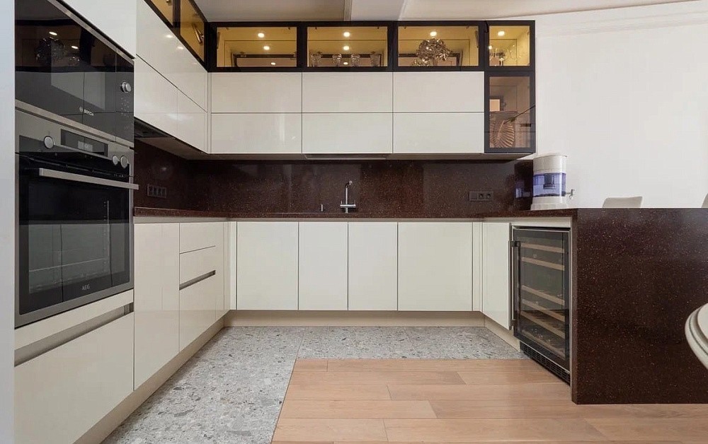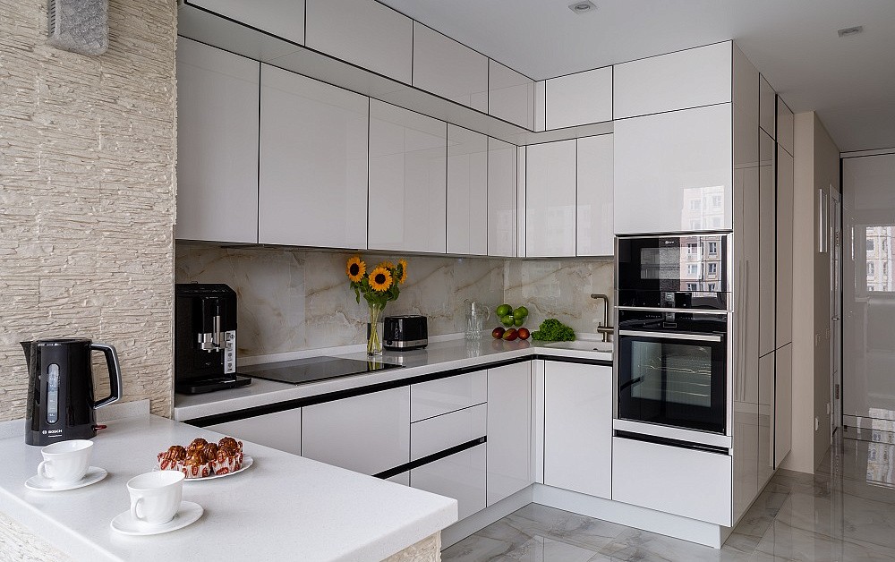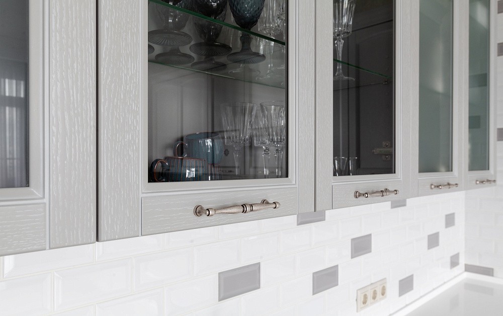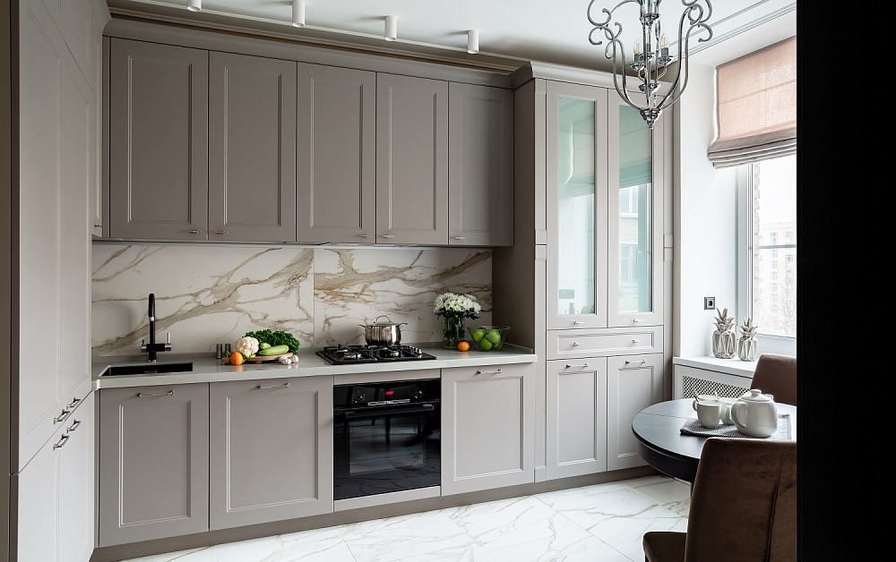 Высокие шкафы-пеналы обычно устанавливают по краям. В них можно спрятать некоторую бытовую технику, а на самые верхние полки убрать предметы, которые используются очень редко.