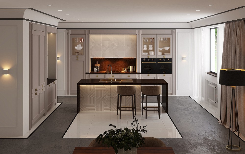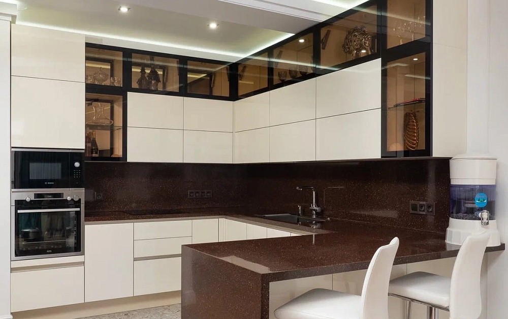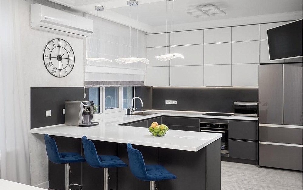 В больших помещениях кухня и гостиная часто оказываются совмещенными. Визуально отделить одну зону от другой можно с помощью островной конструкции, барной стойки или стеллажа. Зонирование с помощью кухни на заказ от производителя технически выполнить гораздо проще. Дело в том, что комплект будет изготовлен с учетом архитектуры пространства.
