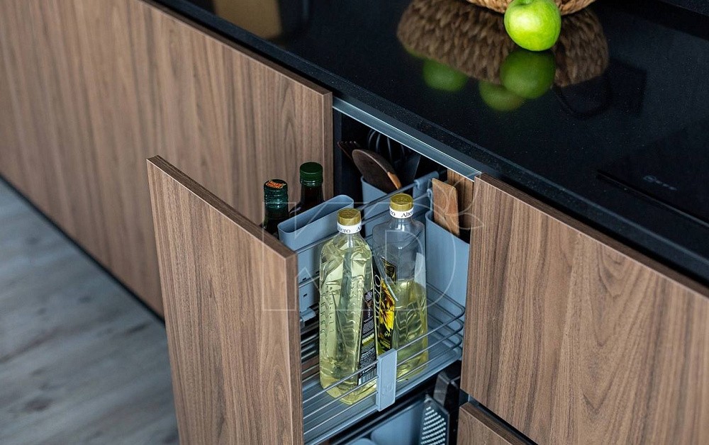Все кухонные гарнитуры имеют рабочую поверхность, под которой устанавливают места хранения. Специалисты рекомендуют оборудовать нижние модули выдвижными полками, так как они вмещают большое количество предметов и более удобны в использовании. Традиционные ящики лучше оснастить разделителями, что обеспечит комфортное размещение предметов.