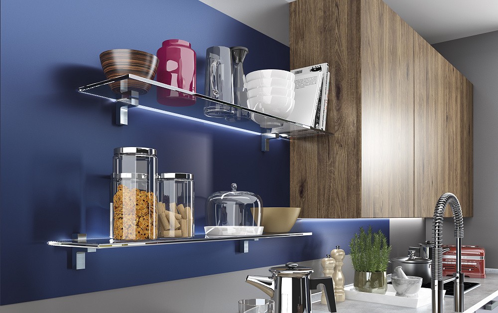 • сборку со встроенными витринами и светодиодной точечной подсветкой лаконичных фасадов;