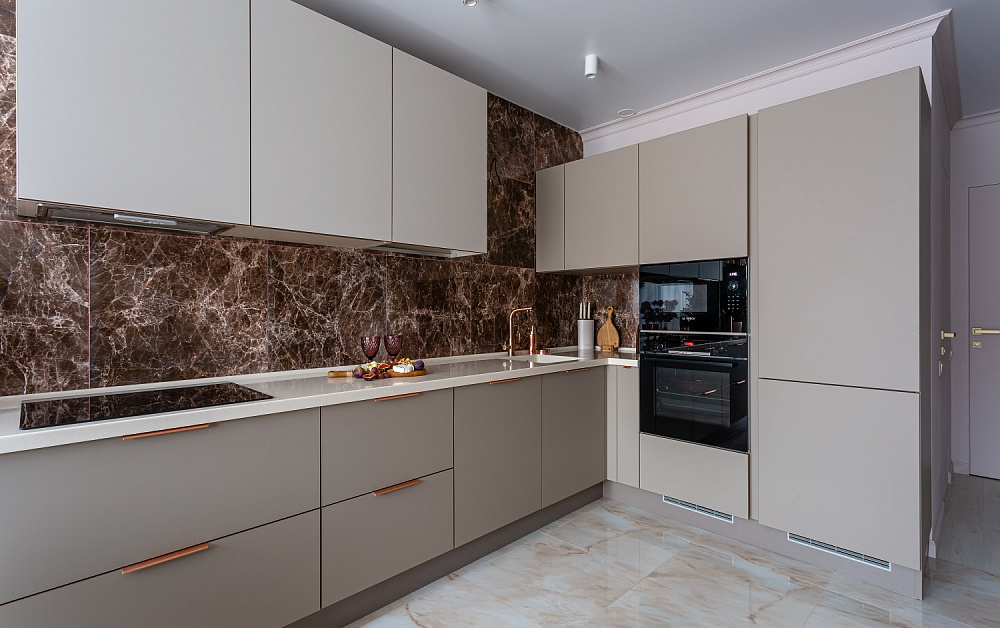 3. Если хозяйке нравится более спокойная палитра оттенков для оформления фасада, то стоит обратить внимание на такие цвета, как белый, бежевый, кремовый, серый и металлик. Такие фасады сейчас на пике трендов!