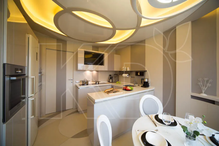 На этапе проектирования определяется не только форма мебели, но и то, чем будет укомплектован кухонный гарнитур. Количество выдвижных ящиков, открытых и закрытых полок выбирается с учетом размеров комнаты и уровня ее освещения.