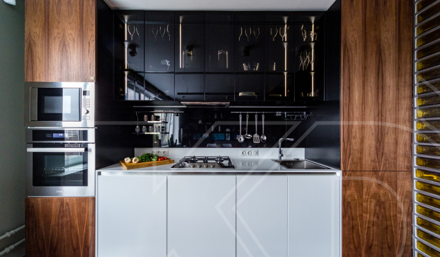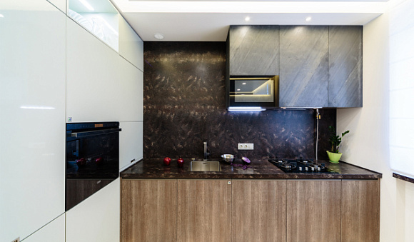 При оформлении кухни коричневых цветов с двухрядной конструкцией следует сделать верхнюю часть более темной. Подобный вариант примечателен тем, что у владельца помещения появится возможность подчеркнуть оригинальность дизайнерской задумки. При этом важно придерживаться принципа светлого верха и темного низа помещения. Результат – уравновешивание общего плана комнаты.