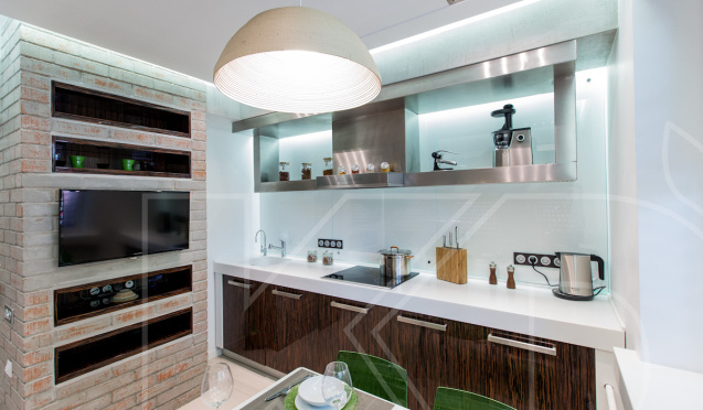 В минимализме крайне редко клеят обои. Как правило, отдается предпочтение штукатурке и покраске стен. Альтернативное решение – глянцевая плитка с имитацией кирпича. Для фартуков используют мозаику, металл и закаленное стекло.