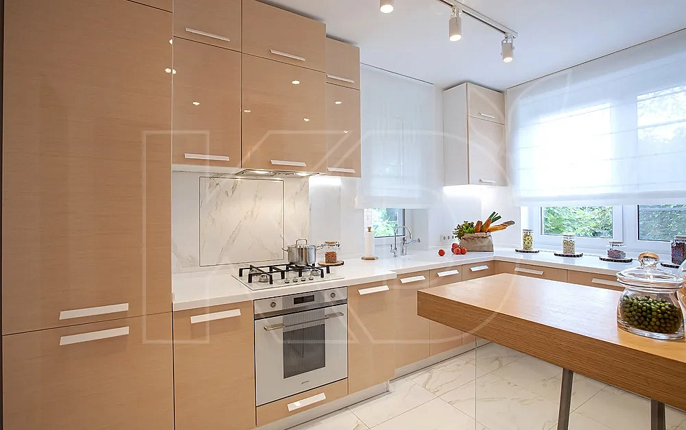 Чтобы П-образным гарнитуром было удобнее пользоваться, расстояние между противоположными сторонами должно составлять 1,2-1,5 метра. В противном случае пользоваться бытовой техникой и открывать шкафы будет неудобно.