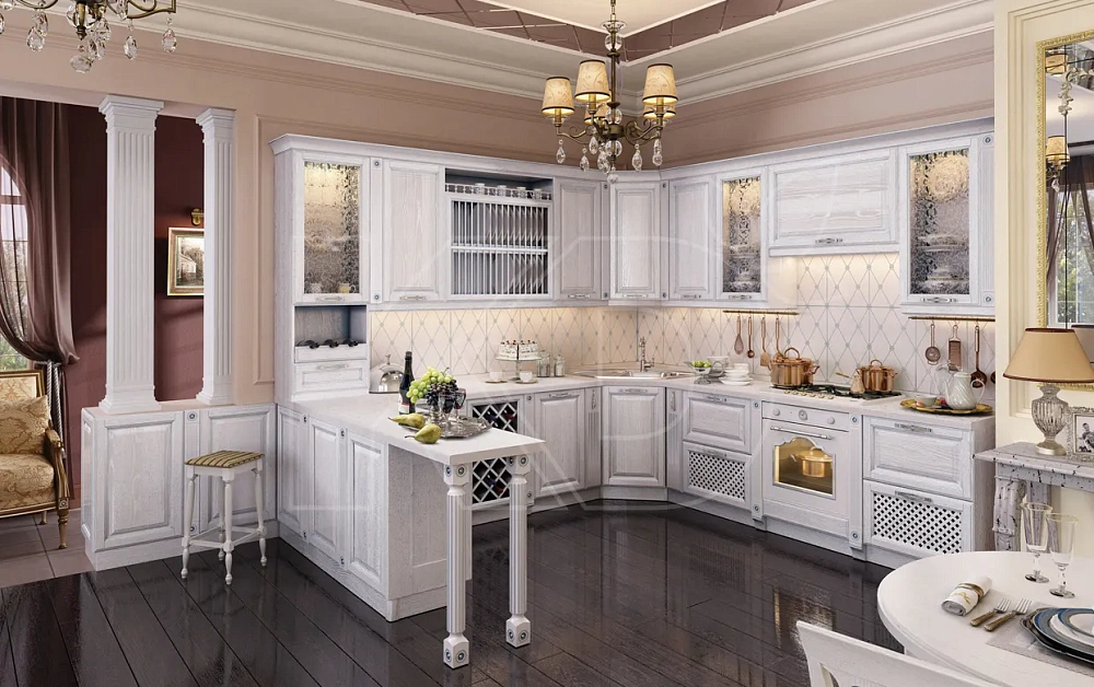 Для большей вместительности верхний ряд модулей белого комплекта делают двойным. В шкафах под потолком хранят банки для солений, праздничные сервизы и другие предметы, которые не требуются для ежедневного пользования.