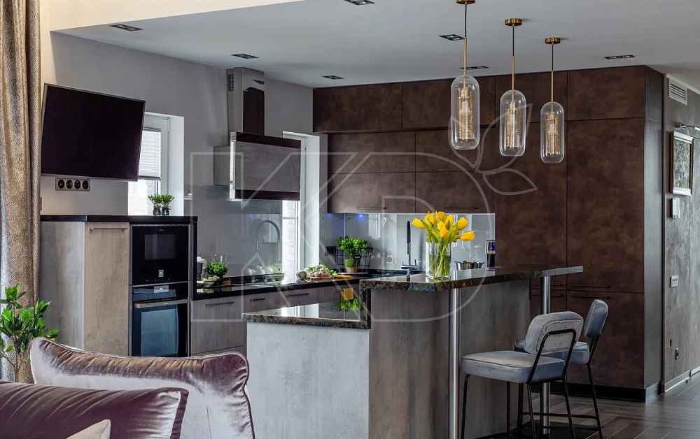 Для просторной квартиры-студии идеальным решением станет островная модель кухни. Гарнитур с такой планировкой подходит для зонирования помещения, потому что остров способен визуально отделить кухню от остального пространства.