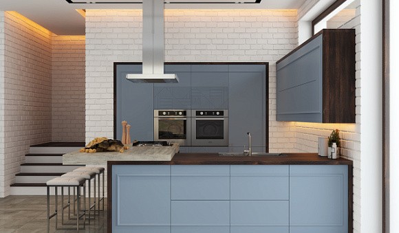 Всю брутальность стиля кухни лофт отлично раскрывает полуночно-синий кухонный гарнитур. Он отлично выглядит на фоне грубой кирпичной кладки и в бетонных антуражах.