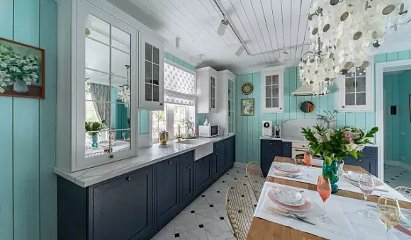 Если вы любите деревенский колорит, то оформляйте кухни синего цвета в стиле кантри. Кухня кантри подразумевает использование естественных тонов и натуральных материалов. Для полноты картины можно дополнить кухонный гарнитур синего цвета эффектом старины.