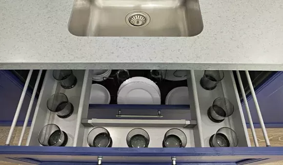 Ключевыми оттенками считаются лазурно-серый, почти на стыке с мятным, а также цвет синей стали. Кухонному гарнитуру в таком направлении характерны: