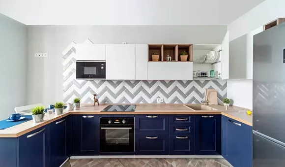 Подбор планировки полностью основывается на числе квадратных метров и конфигурации помещения. Пожалуй, самым востребованным вариантом считается гарнитур в виде буквы Г. В случае с синей мебелью угловая кухня имеет еще одно преимущество: вы можете органично добавлять любой контрастный цвет на иную стену.