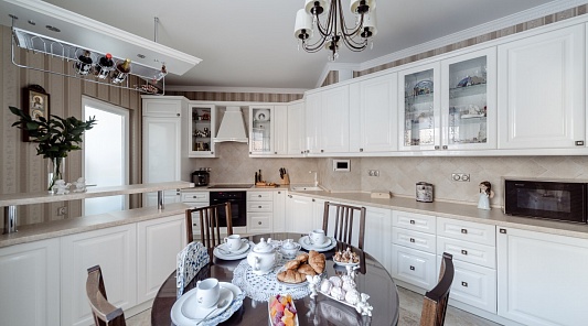 Белая кухня будет гармонично смотреться и в просторном помещении, например, большой столовой или квартире-студии. Она создаст вокруг ощущение чистоты и уюта, наполнит атмосферу воздухом и светом. И если в условиях недостатка места лучше предпочесть стандартные прямые или угловые гарнитуры, то на большой площади можно с комфортом разместить модель с функциональным островом, полуостровом или барной стойкой.