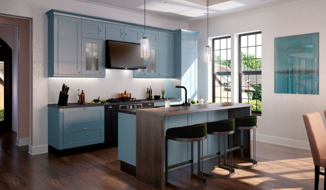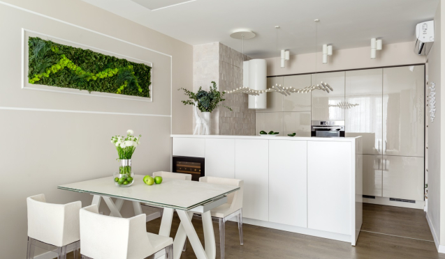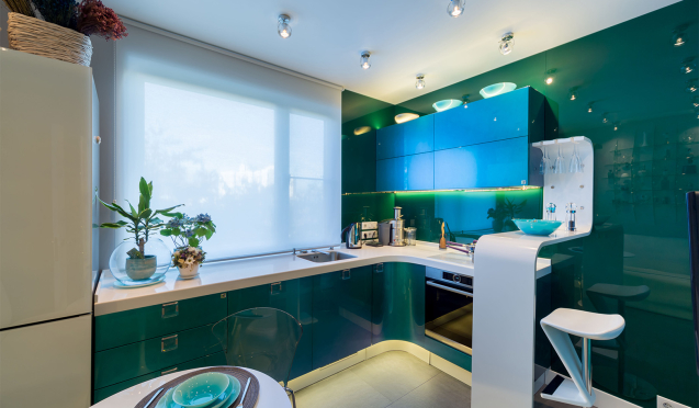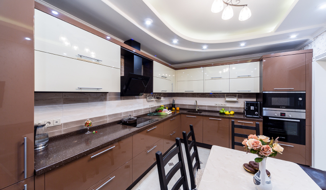 На первом этапе необходимо выбрать цвет стен, потолка и пола. Понять, какими будут фасады гарнитура – глянцевыми или матовыми, плоскими или филенчатыми.