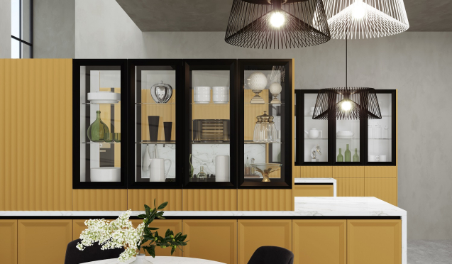 • С черным. Подобная комбинация используется обычно в больших помещениях. Кухонный гарнитур желтого цвета можно обыграть черными деталями – полками, вставками, столешницей и фартуком.