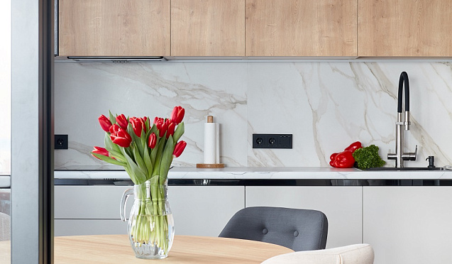 Выгода внушительна, а проект – прекрасен, ведь в нём гармонично замиксованы модный soft minimal и эко-стиль. Образ кухни выстроен на беспроигрышном сочетании чёрного и серого цветов с добавлением древесных фактур. Фасады «под дерево» созданы из экоплиты и взяты от гарнитура «Стоун Вуд». А поверхности цвета «серый шёлк» достались проекту от «Фаворита-1» – флагманской модели от КД. Все фасады легки, долговечны, а также устойчивы к механическим повреждениям, перепадам температур, загрязнениям и солнечному ультрафиолету. Как раз то, что нужно для современной кухни!